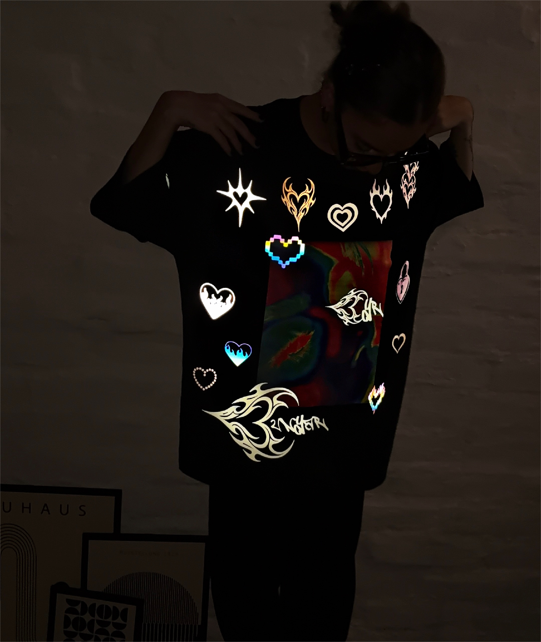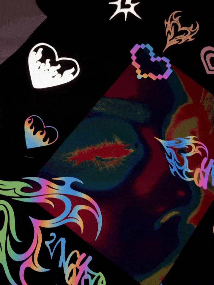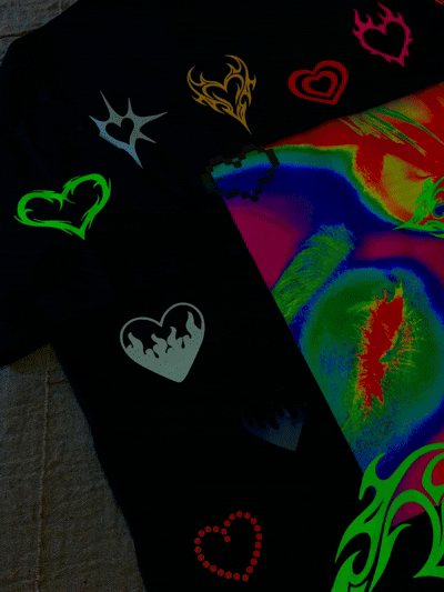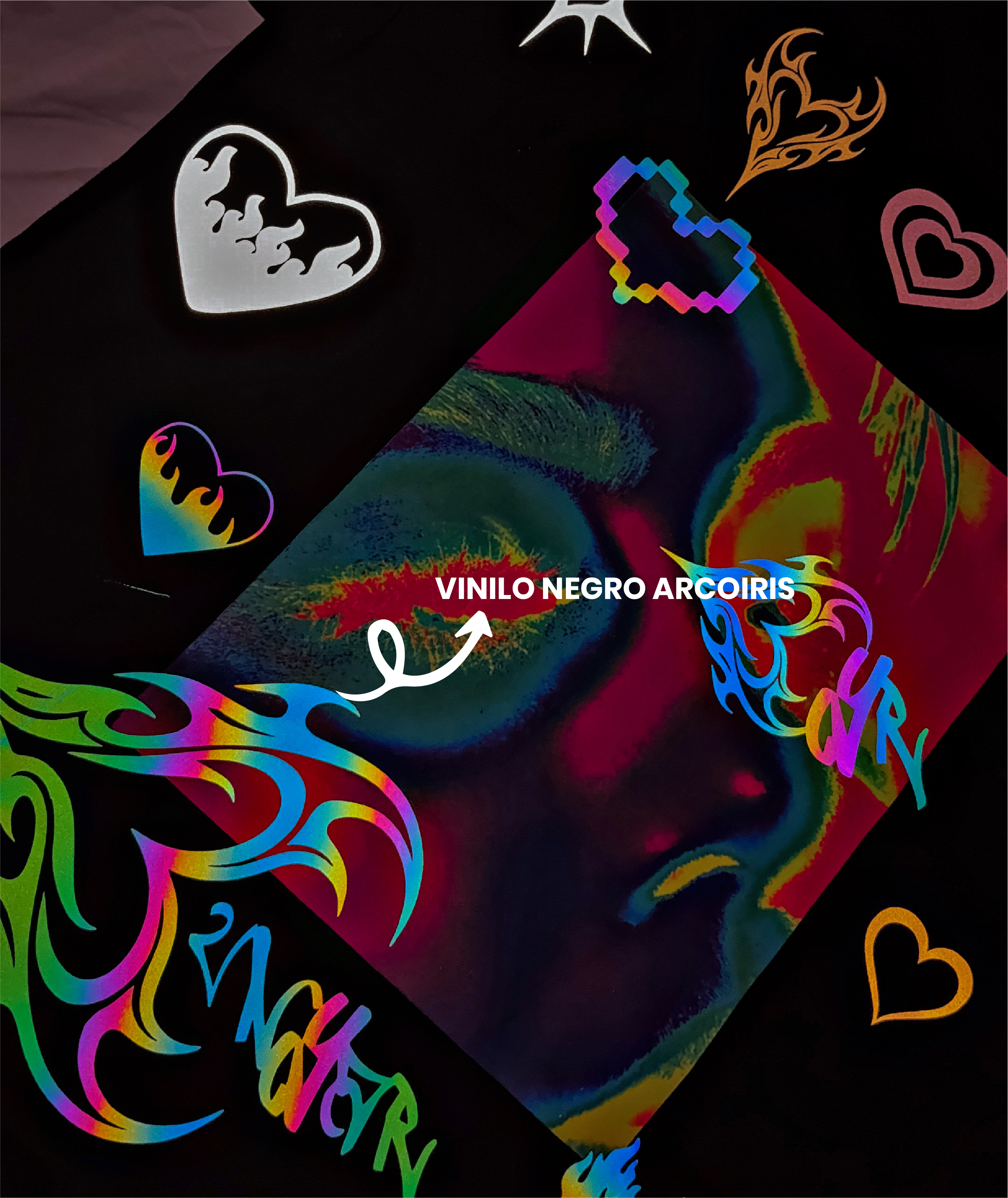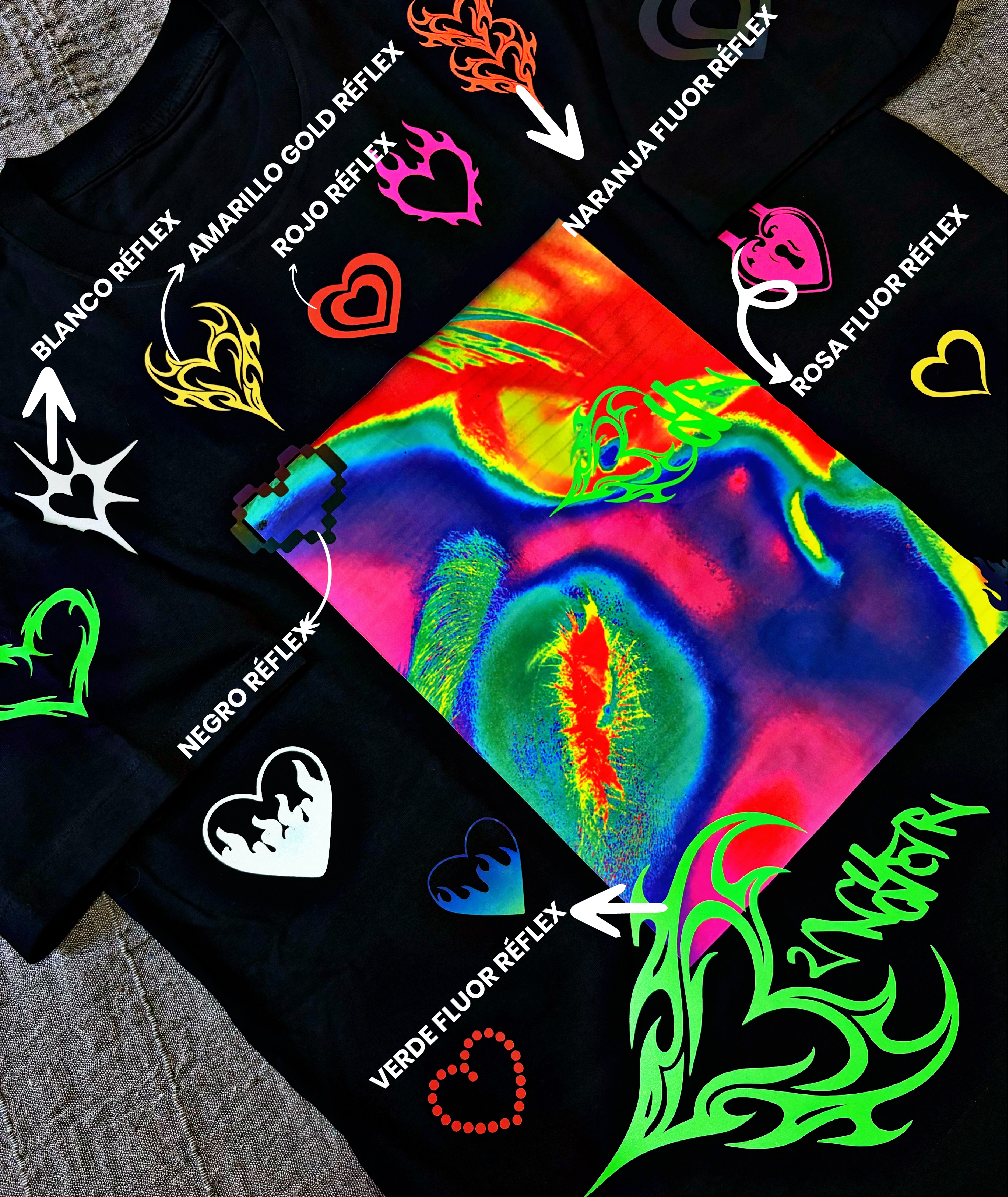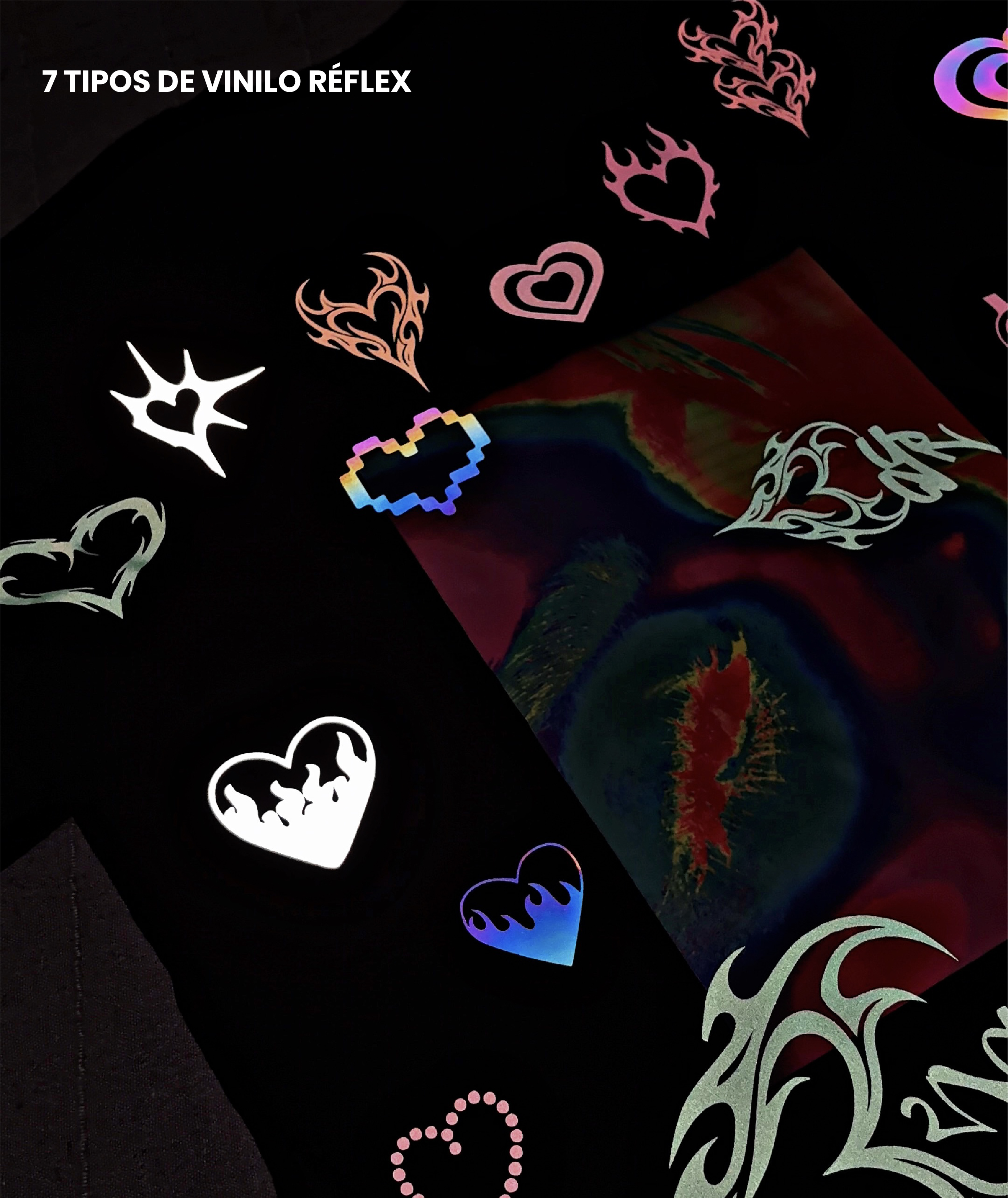 Vinilos refléx: Verde fluor, rosa fluor, naranja fluor, amarillo gold, rojo, blanco y negro: Los vinilos brillan al ser reflejados con la luz del sol o del flash.