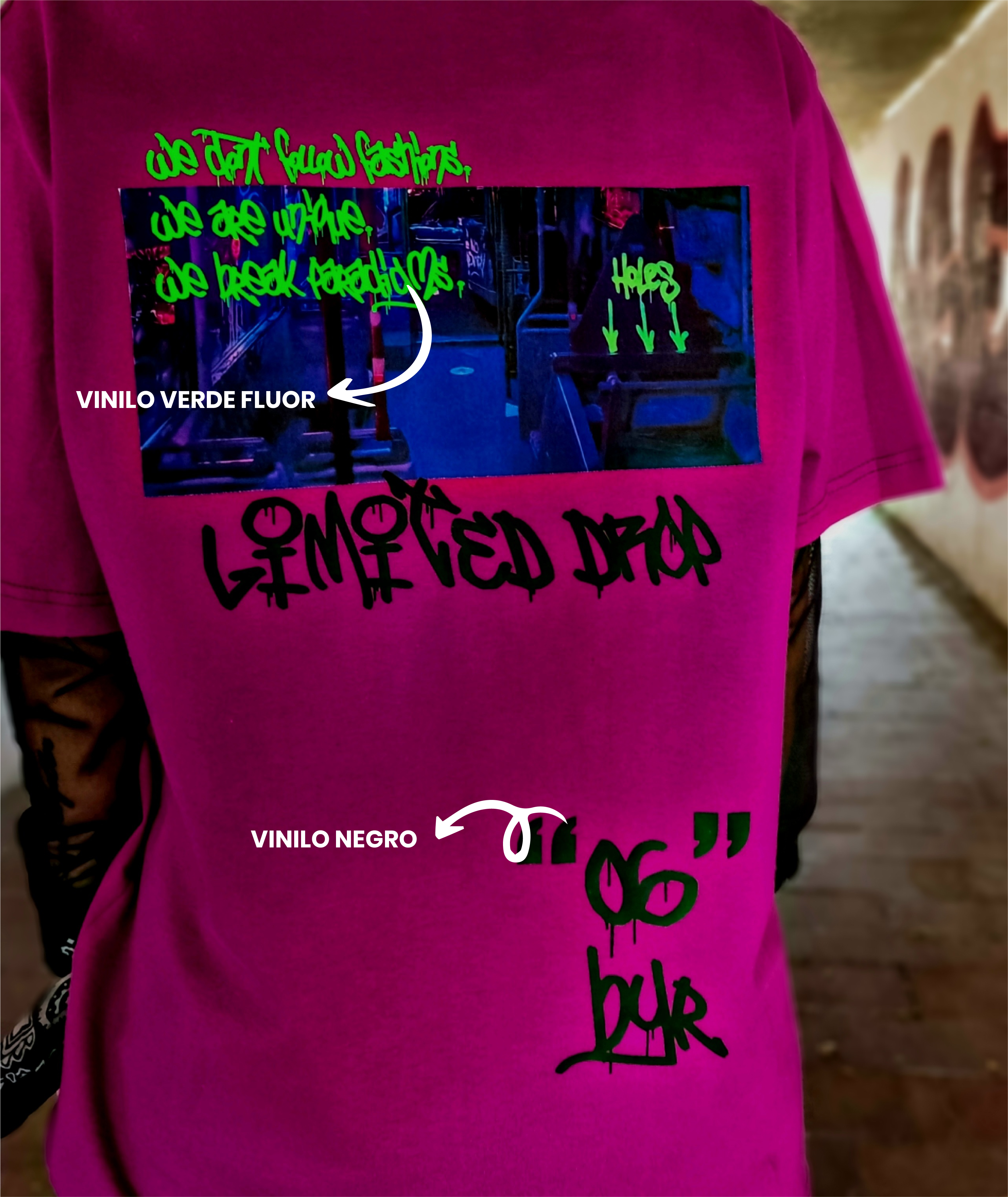 Cada diseño se estampa de manera manual, pieza por pieza, utiizando materiales importados para lograr un resultado único. Lleva vinilo negro y verde fluor.